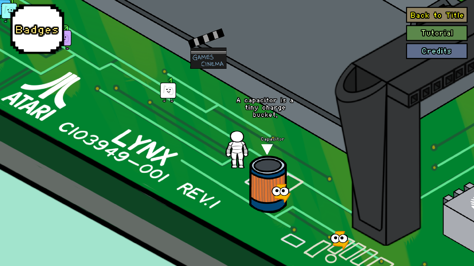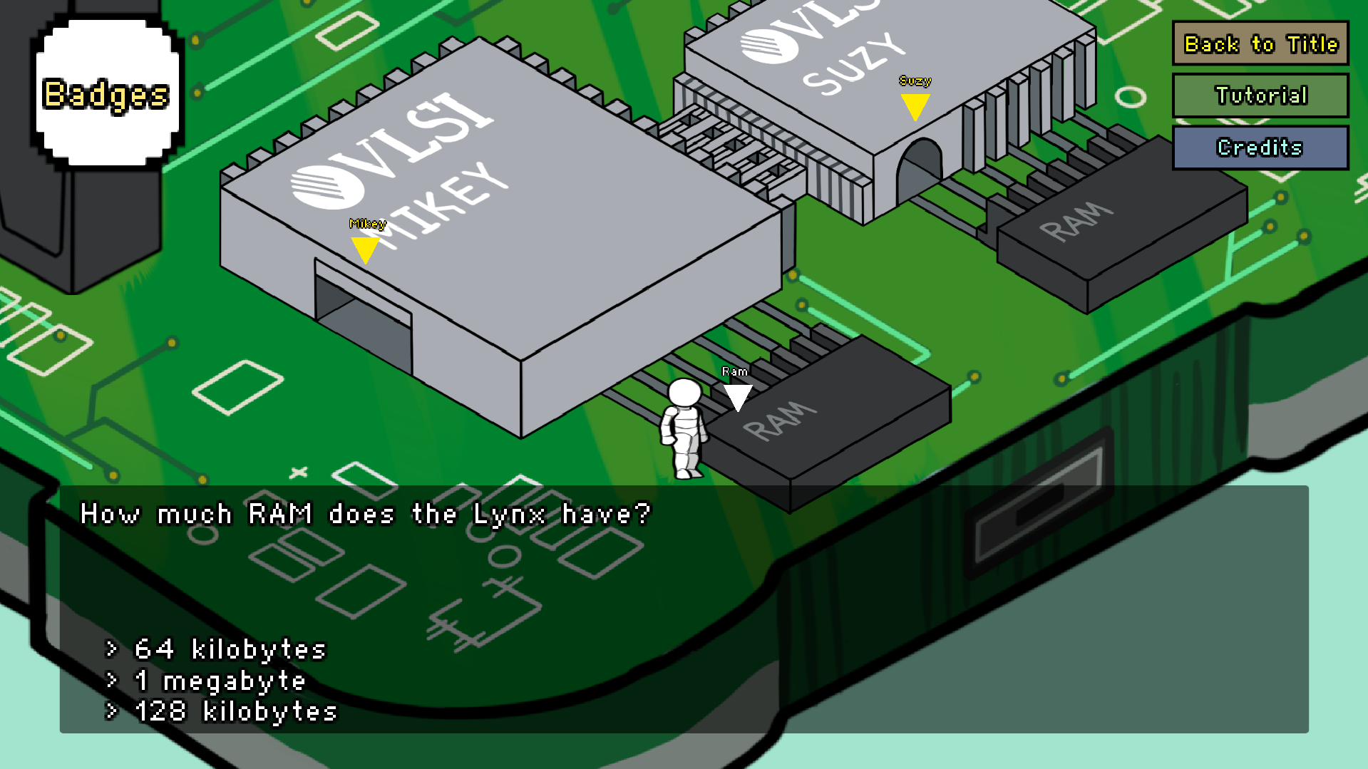 Shrink down and step onto the Atari Lynx motherboard, where the chips and circuits will actually chat to you! Team up with Mikey and Suzy in two fast, learn-as-you-play mini-games. Acquaint yourself with other hardware components like capacitors, RAM, screen at mini quiz stops where you can earn cool badges as you learn more and more!